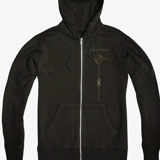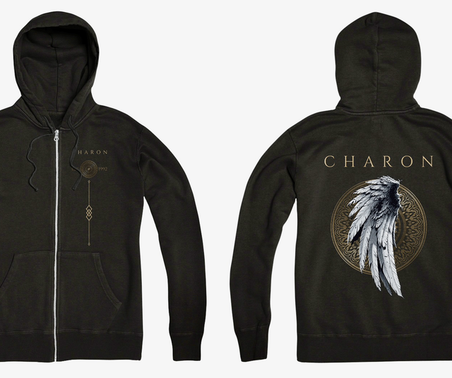 Charon - Zipper Hoodie - unisex. Small screenprinted image on front, large "siipi" design screenprinted on back.